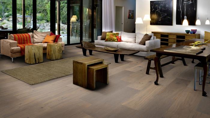 This single-strip oak floor from the Grande Collection features a delicate grey stain, which allows the softer sepia tones in the timber to come through. Each board is meticulously hand-scraped, which enhances the rustic appearance of the floor. Four-sided bevelling at the edges ensures a classic, full plank look and feel. This product must be oiled after installation and prior to use.