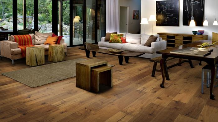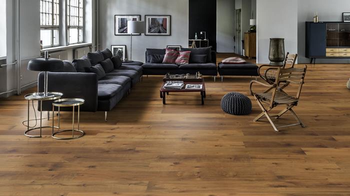 The warm brown hues in this lightly smoked, single-strip oak floor from the Domani Collection highlight its rustic expression. Knots and cracks pepper the boards, resulting in a beautifully aged effect reminiscent of reclaimed timber. Four-sided micro-bevelling at the edges ensures a classic full plank look and feel. Hand-scraping enhances the worn appearance of the floor.
