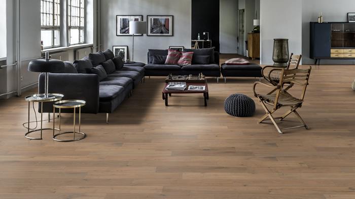 A misty-grey stain gives this single-strip oak floor from the Rugged Collection a calm and pared-back feel, while knots and cracks create a rustic expression. Each board is carefully brushed to bring out the character of the grain and highlight the natural texture of the wood. Four-sided bevelling at the edges ensures a classic, full plank look and feel. Hand-scraping enhances the worn appearance of the floor.