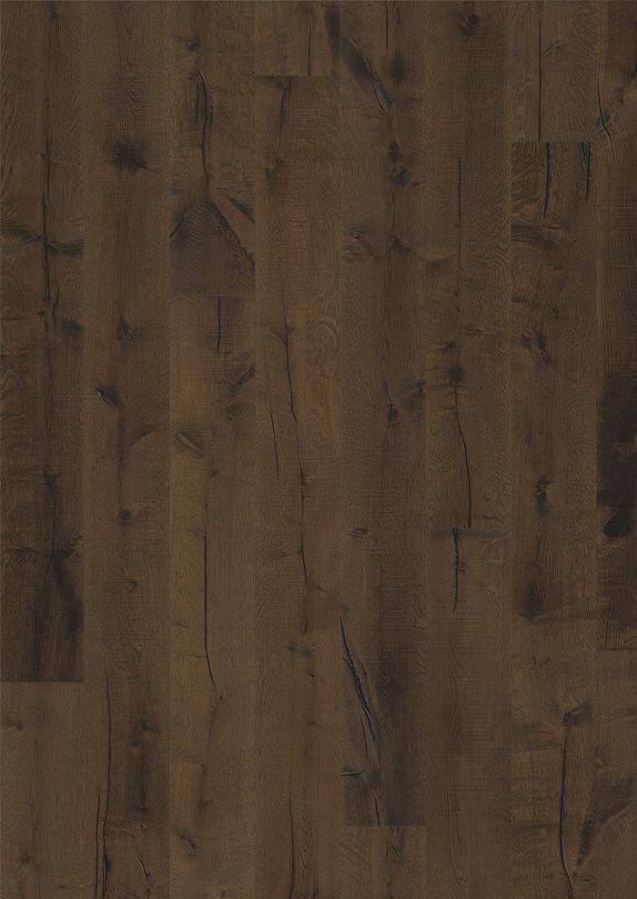 The rich, coffee stain on this single-strip oak floor from the Småland Collection allows the fully smoked, charcoal nuances in the wood to seep through, resulting in a very rustic expression. Light and dark contrasts in the wood are punctuated with occasional saw marks, which give the floor its restored appearance. Four-sided bevelling at the edges ensures a classic, full plank look and feel. Each board is meticulously hand-scraped, which enhances the rustic appearance of the floor.